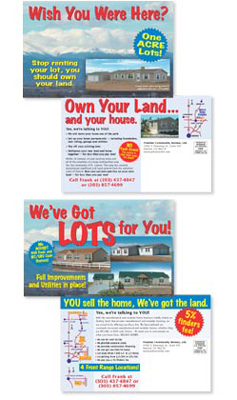 Direct mail postcard campaign promoting home sites in four locations